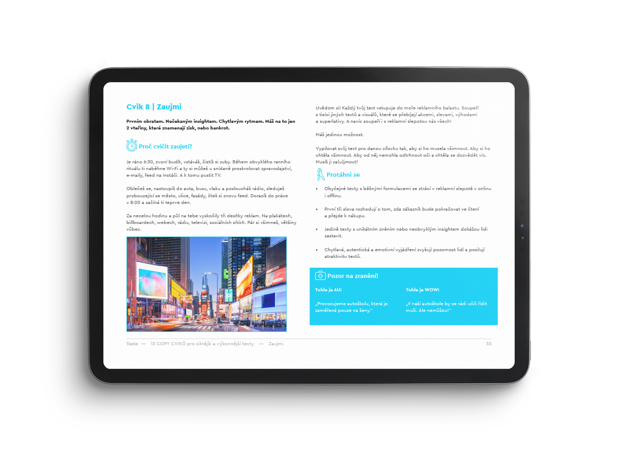 Tomášovy „Copy cviky" s čistým svědomím doporučím každému začínajícímu i středně pokročilému copywriterovi. Jsou svěží, vtipné, přehledné a srozumitelné. Příklady z praxe fungují na jedničku. A fitness analogie průběžně připomínají, že skvělé texty nevznikají „omylem" – musí se poctivě odmakat.